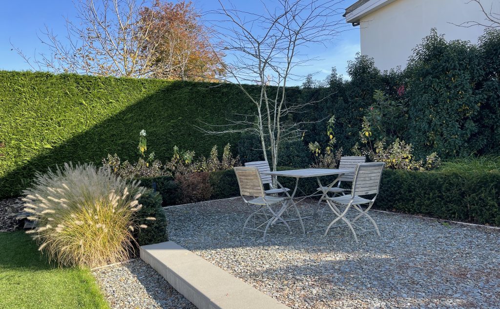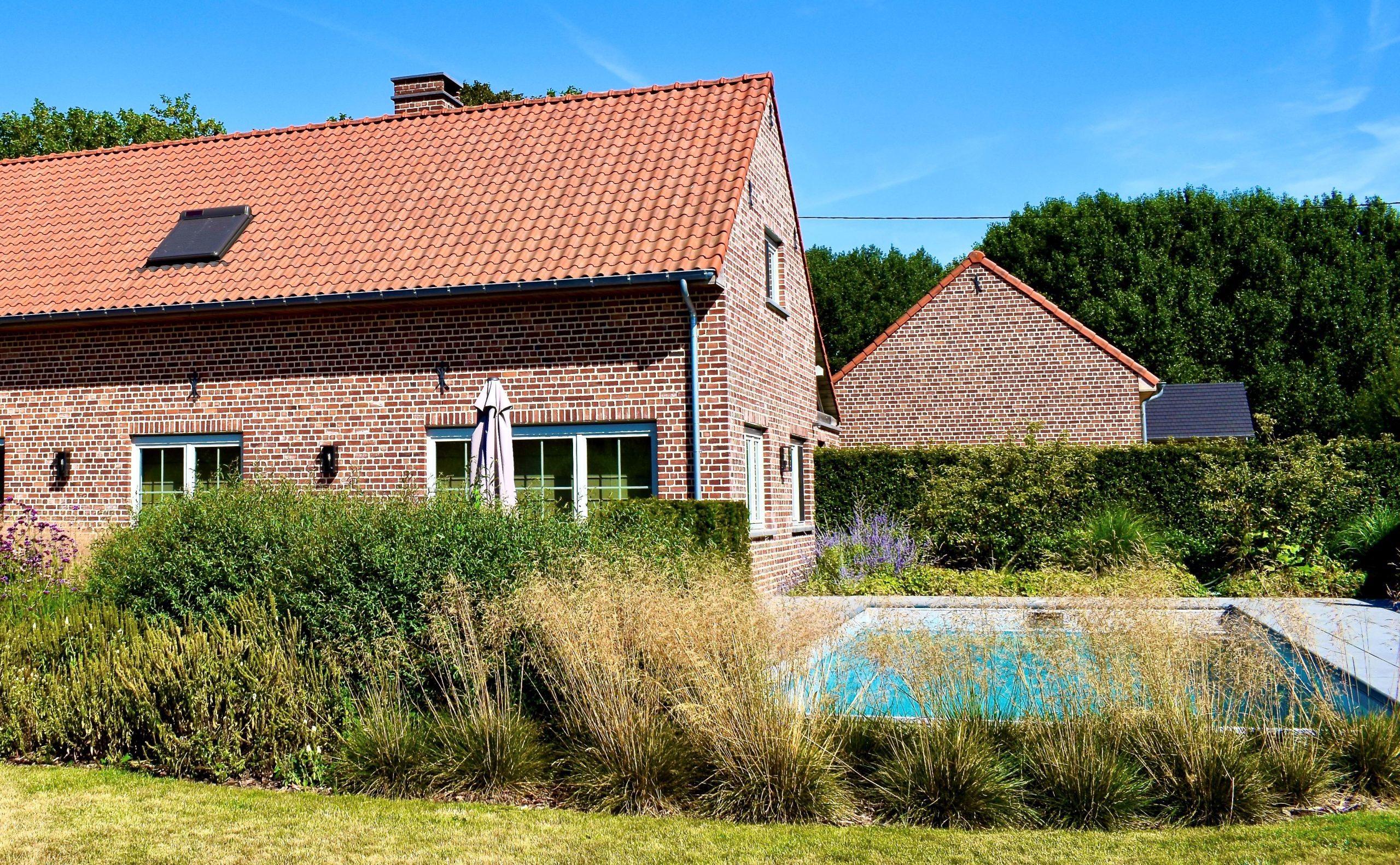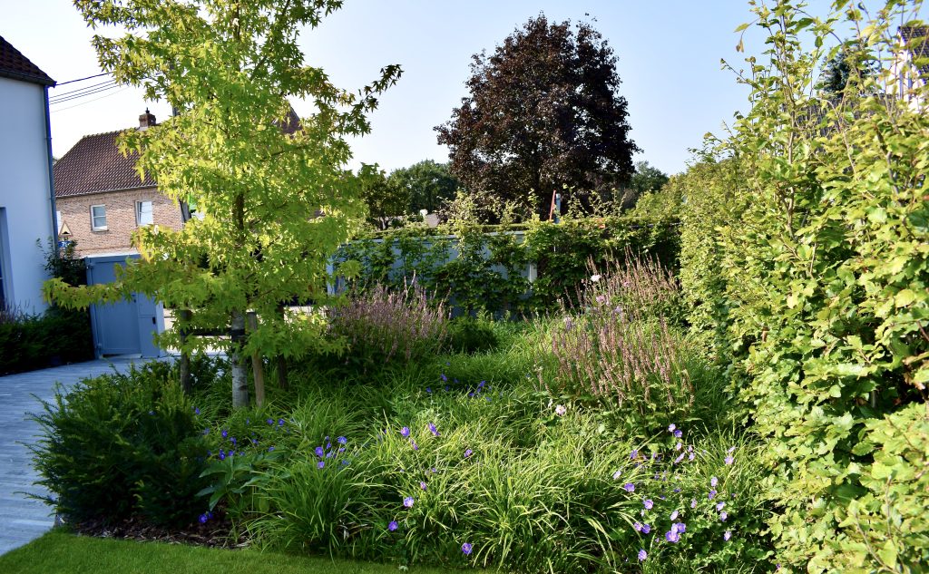 Een klassevolle tuin in Woluwe, in een natuurlijke en luchtige stijl, makkelijk in onderhoud. O.a. Krentenbomen, valse Christusdoorn en siergrassen omarmen hier een klassevolle villa.